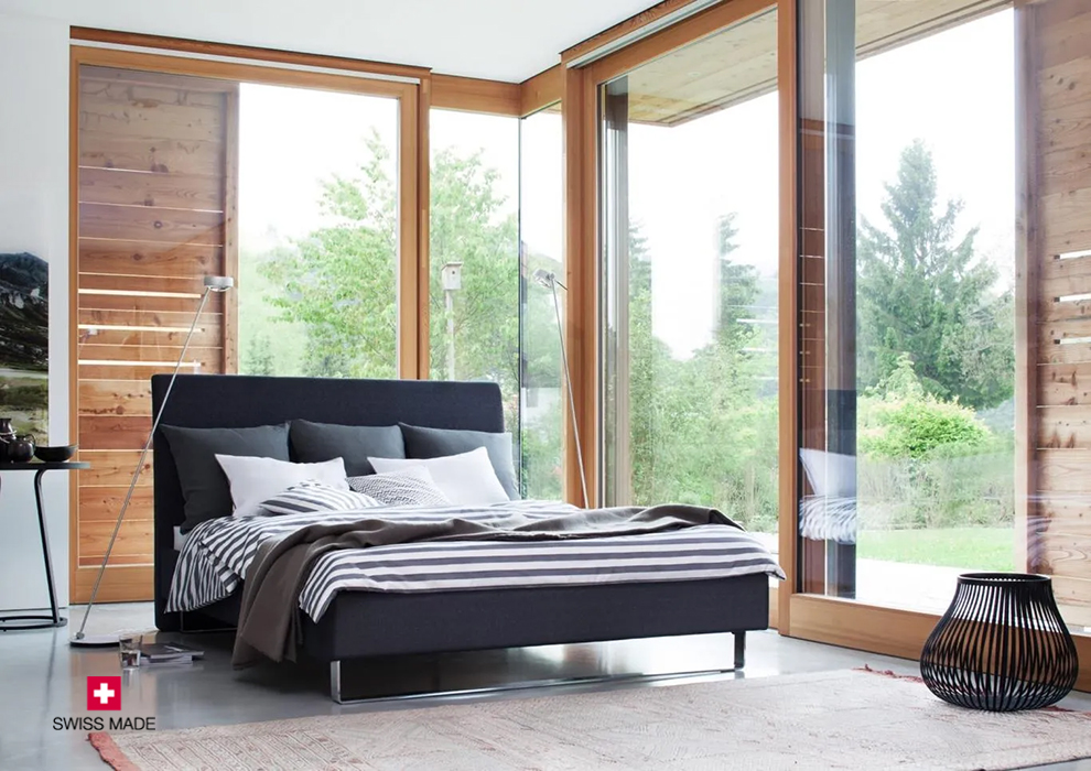 La ligne Espace dispose d‘un socle noir, de 5 cm de haut, qui peut également être remplacé par des roulettes, des pieds ou des patins au choix. Le modèle est disponible en version standard avec un cadre de 24 cm ou en version confort avec un cadre de 30 cm.